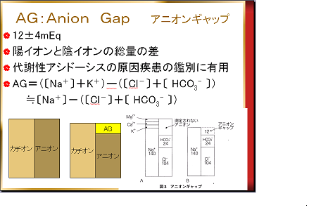 正常値は、12±4 mEqということになっていますが、何のことかというと陽イオンと陰イオンの総量の差で代謝性アシドーシスの原因疾患の鑑別に有用ということになっています。
